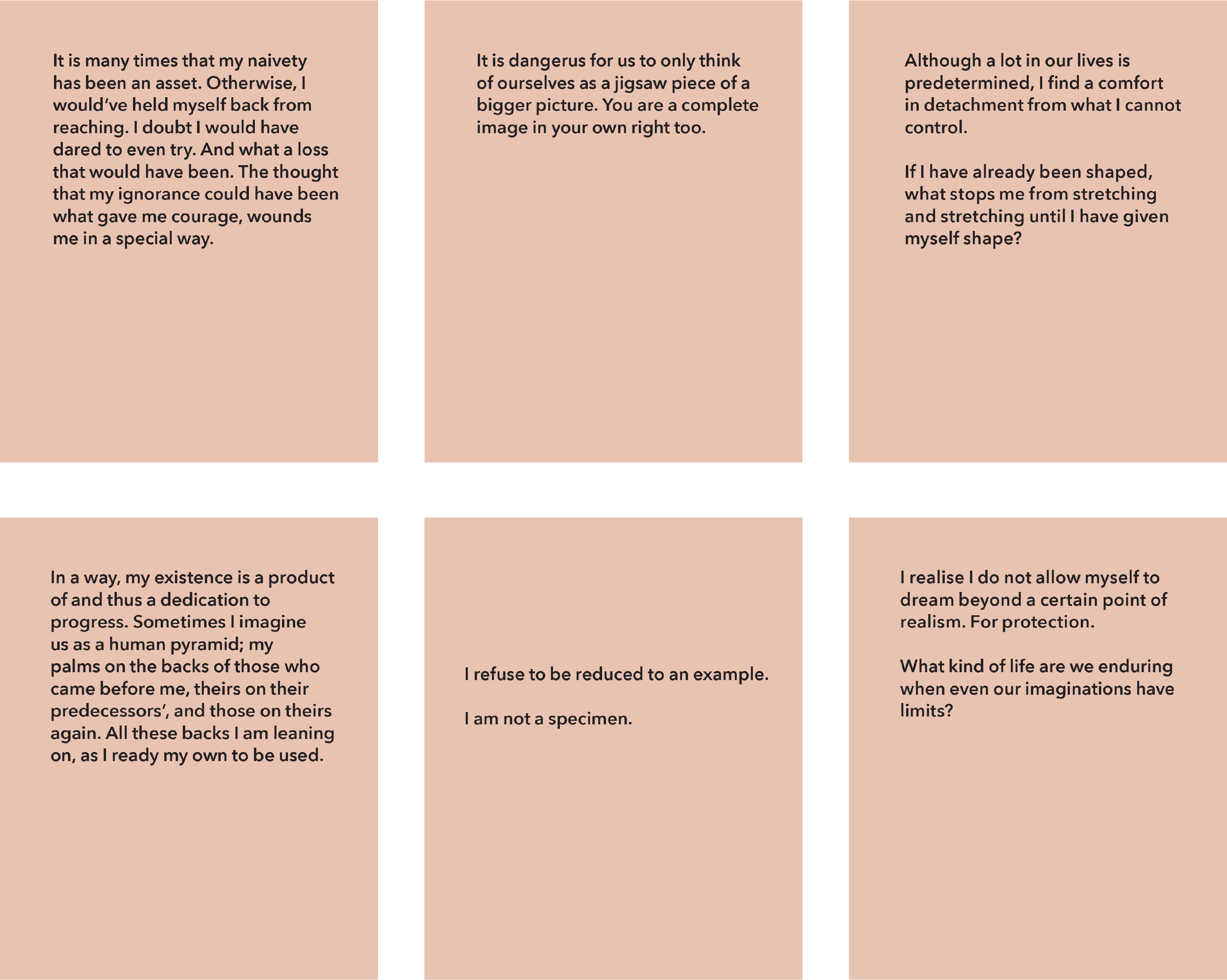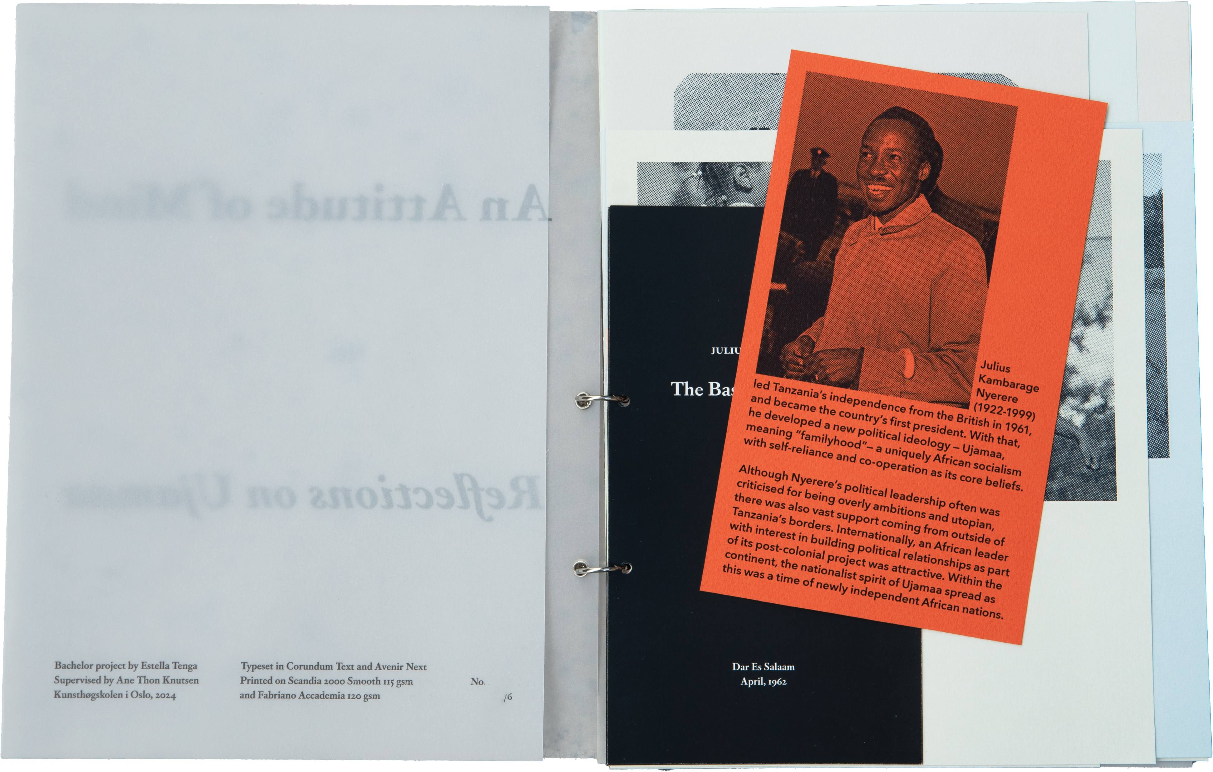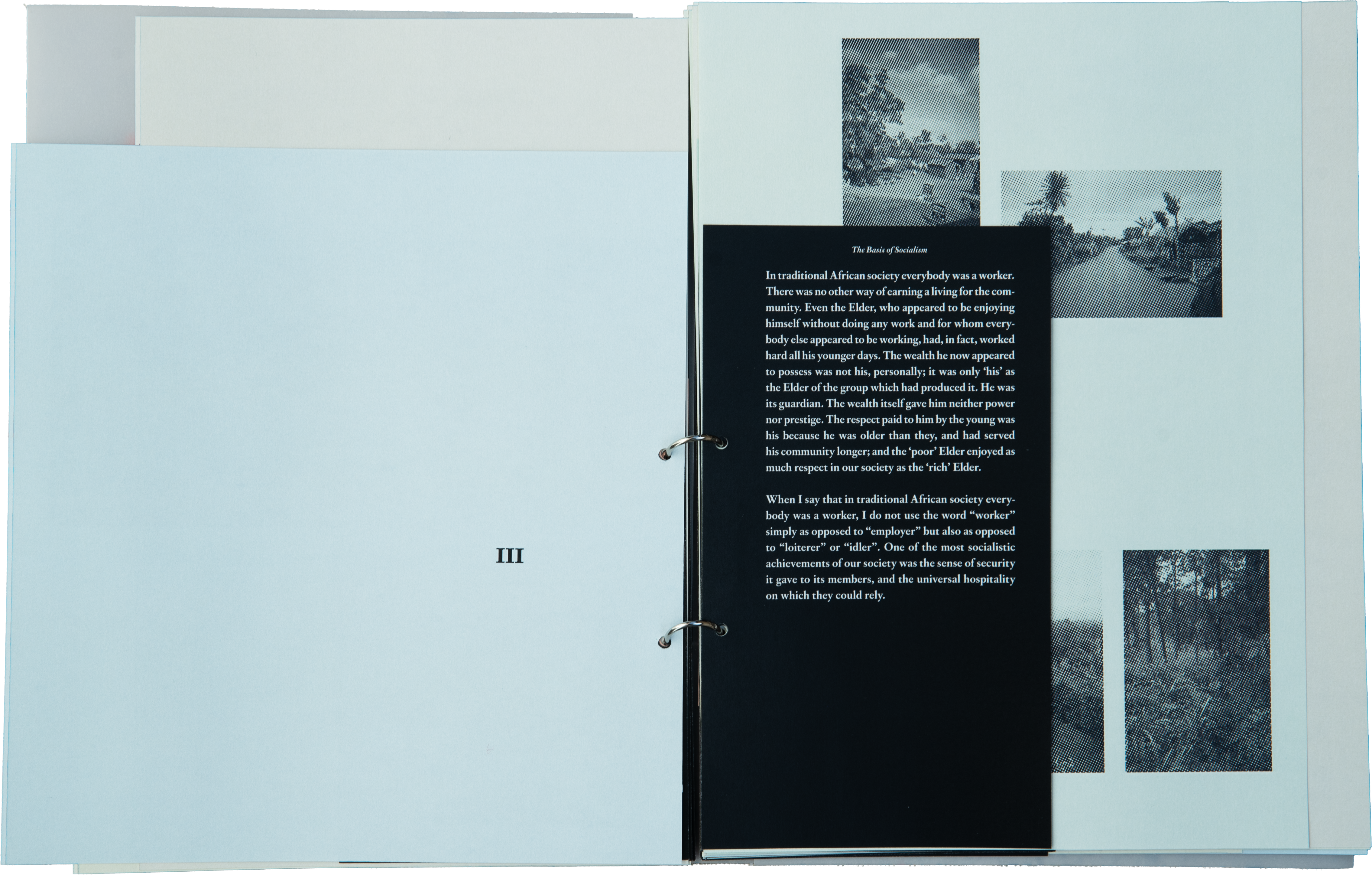 Book project based on the political manifesto “The Basis of African Socialism” written by Tanzania’s first president Julius Nyerere in 1962. The book consists of three narratives – Nyerere’s original text (25 pages), my experiences (14 pages) and my own written reflections (6 pages) – and a reflection on experience and identity.